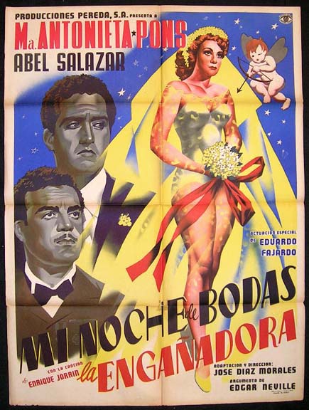 Charming comedy film poster pictures Cupid preparing to shoot his arrow at the sexy Pons, who is wearing a very revealing wedding dress. Two men -- her late husband and future husbands -- look on with interest. There is a small piece of tape on the back which has left a light tape mark at the center of the bottom fold line, but this flaw is NOT very noticeable. Otherwise, colors are bright and the onesheet will display beautifully... This movie starred Maria Antonieta Pons, Abel Salazar, Eduardo Fajardo and Consuelo Guerrero de Luna. $40 |
