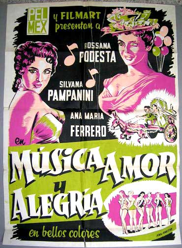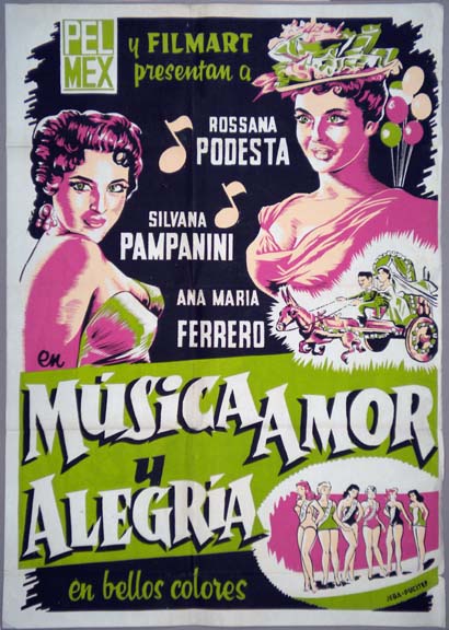 Stylish Mexican musical film poster features a striking image of the two sexy stars. This is a 'screen' style poster, rather than a typical printed poster... This movie starred Rossana Podesta, Silvana Pampanini and Ana Maria Ferrero. $20 |