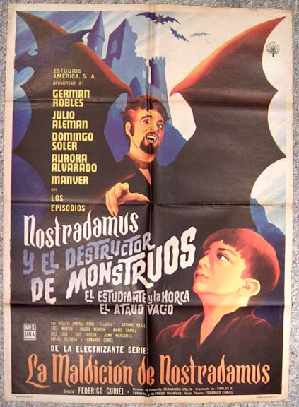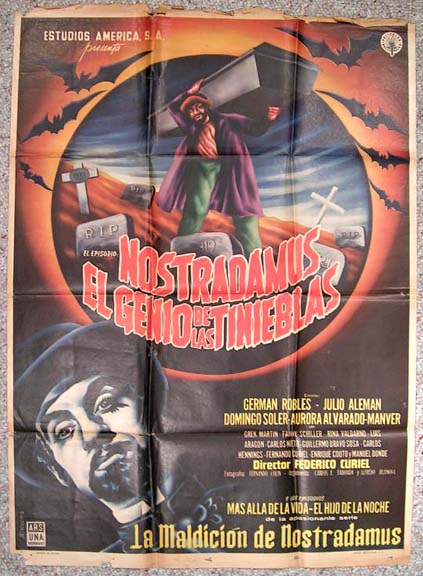 Perhaps the best of the Nostradamus posters, this one has fabulous color and atmospheric horror graphics, a blue-faced vampire, including flying bats and a grave robber in an eerie cemetery. This was the third film in the 'Nostradamus' horror series. Great onesheet, as are all the posters from this series! The film was released in the USA as, Nostradamus and the Genii of Darkness. There is some heavy wear along the borders and also a bit of wear/separation on fold lines, but most of the flaws do not greatly detract from the superb graphics... This movie starred German Robles, Julio Aleman, Domingo Solar and Aurora Alvarado. $30 |