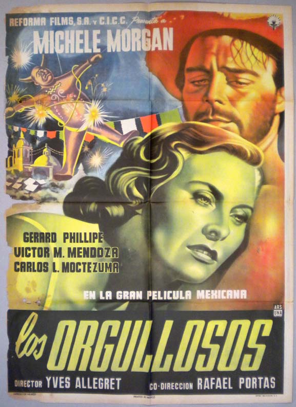 Attractive Mexican film poster with a great image of Ms. Morgan embracing Mr. Philipe. The poster features vibrant coloring and a classic design. The film was ralso released as, The Proud and the Beautiful. The poster got damp along one edge at some point and this has resulted in heavy water damage along the left side -- including discoloration and holes --entering well into the printed portion. However, the colors are still strong, and if matted and framed, it will display fairly well... This movie starred Michele Morgan, Gerard Philipe, Victor Manuel Mendoza and Carlos Lopez Moctezuma. $20 |