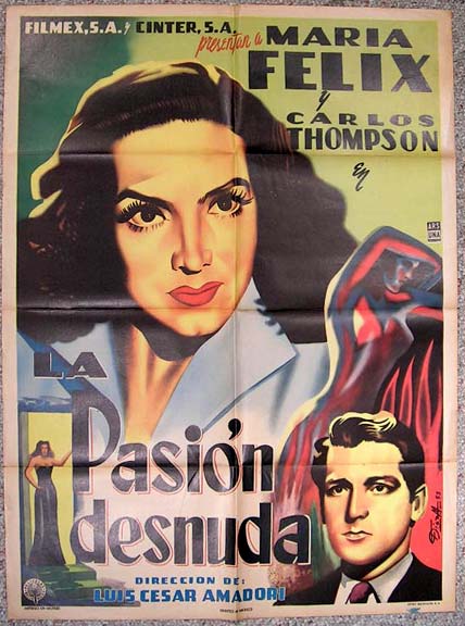 Beautiful Mexican film poster features a classic image of Maria Felix -- perhaps the biggest star in the history of Mexican cinema. The onesheet also pictures a stylized image of a nude woman -- possibly also Ms. Felix. A lovely poster with vibrant coloring. This is a lightly used poster with mild wear and some tape on back reinforcing separation at the center folds, resulting in slight marks of discoloration on the front. Also, someone wrote the film title on the back of the poster, and the lettering has bled through a bit and is now partially visible on the front -- near the word PASION in the title area. However, this flaw is not very distracting, and it could be repaired with minor restoration. Otherwise, the colors are clean and bright and the poster looks great... This movie starred Maria Felix, Carlos Thompson, Eduardo Cuitino and Hector Calcano. $60 |