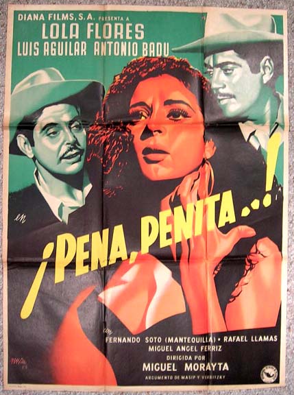 Gorgeous comedy film poster features lurid, melodramatic graphics that make it look more like a film noir / crime movie. The onesheet features great images of the three main stars -- especially the very sexy Ms. Flores. The poster has average signs of use -- including some wear/separation along the fold lines. However, none of these flaws are too distracting, and the onesheet will still display very well... This movie starred Lola Flores, Luis Aguilar, Antonio Badu and Fernando 'Mantequilla' Soto. $60 |