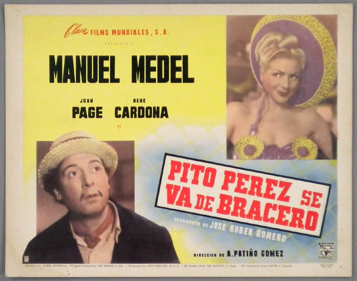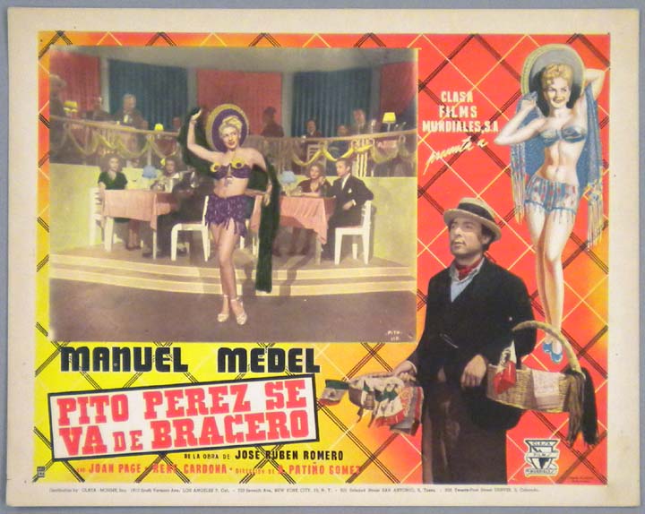 Rare Mexican movie title lobby card for an early comedy film. Mexican title cards are quite rare, as few were ever produced and most lobby card sets do not include one. This one pictures comedian Medel, plus the lovely Ms. Page -- who is dressed in a sexy showgirl outfit... The film starred Manuel Medel, Joan Page, Rene Cardona and Arturo Castro 'Bigoton.' $20 |