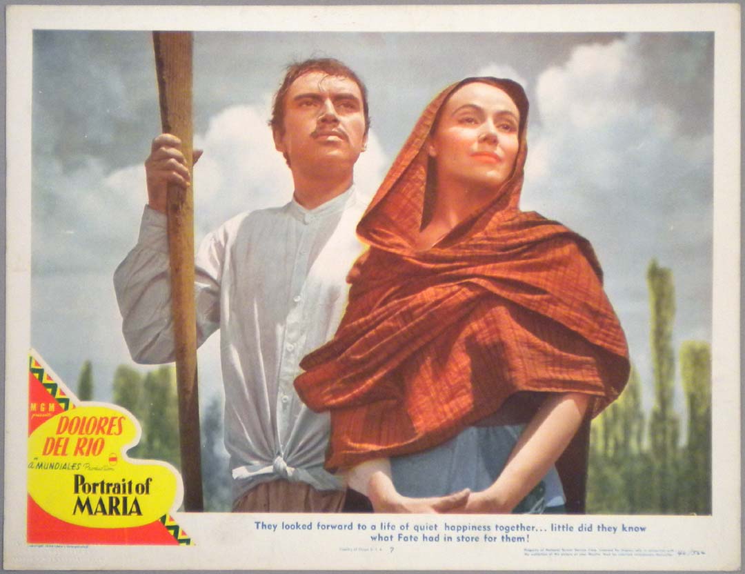 Rare lobby card from the 1944 Mexican fdrama / romance ilm, PORTRAIT OF MARIA, which was released in Mexico as, Maria Candelaria. The card features a wonderful image of Pedro Armendariz kneeling beside a sleeping Dolores del Rio... This movie also starred Pedro Armendariz, Alberto Galan, Margarita Cortes and Miguel Inclan. $20 |