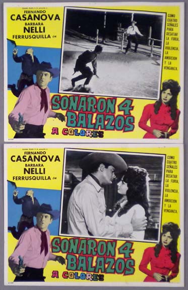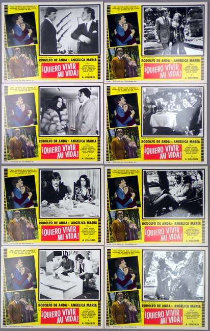 Original set of 8 Mexican film lobby cards which feature colorful artwork and great glossy inset scenes picturing the main stars. You get all 8 cards for one low price! (Any glare visible in the photo was caused by a problem with our camera -- it is not a flaw on the cards themselves)... This movie starred Rodolfo de Anda, Angelica Maria, Jorge Russek and Rafael Baledon. $20 (for 8 cards) |