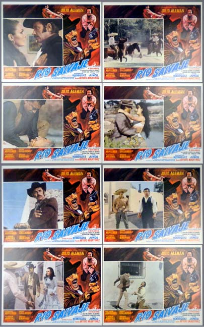Attractive set of 8 Mexican film lobby cards (each card 11x14") which feature colorful artwork and great inset scenes picturing the main stars. You get all 8 cards for one low price! (Any glare visible in the photo was caused by a problem with our camera -- it is not a flaw on the cards themselves)... This movie starred Julio Aleman, Patricia Aspillaga, Claudia Martell, Juan Gallardo and Tito Junco. $20 (for 8 cards) |