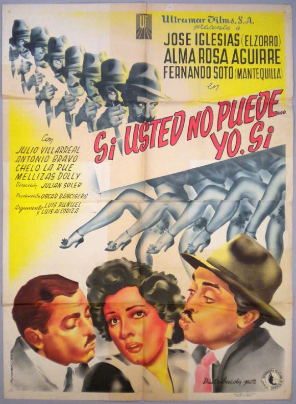 Gorgeous comedy film poster has a delicate style and lovely graphics. There are colorful portraits of three of the stars, but check out those showgirl legs!!! This is a used poster that has some signs of handling-- extra fold lines, edge wear, small tears, pinholes and surface dings -- but the flaws are not very distracting and it will display quite well... This movie starred Pepe Iglesias 'El Zorro,' Alma Rosa Aguirre, Fernando 'Mantequilla' Soto and Julio Villarreal. $40 |