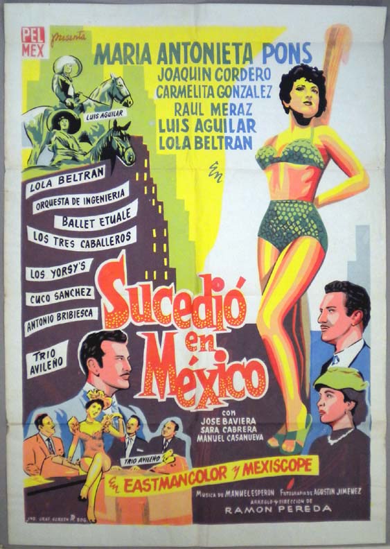 Vibrant Mexican screen style film poster with artwork that was quite unusual for it's time. The onesheet features colorful image of Pons in a bikini, plus pictures other cast members... This movie starred Maria Antonieta Pons, Joaquin Cordero, Domingo Soler, Lola Beltran and Raul Meraz. $40 |