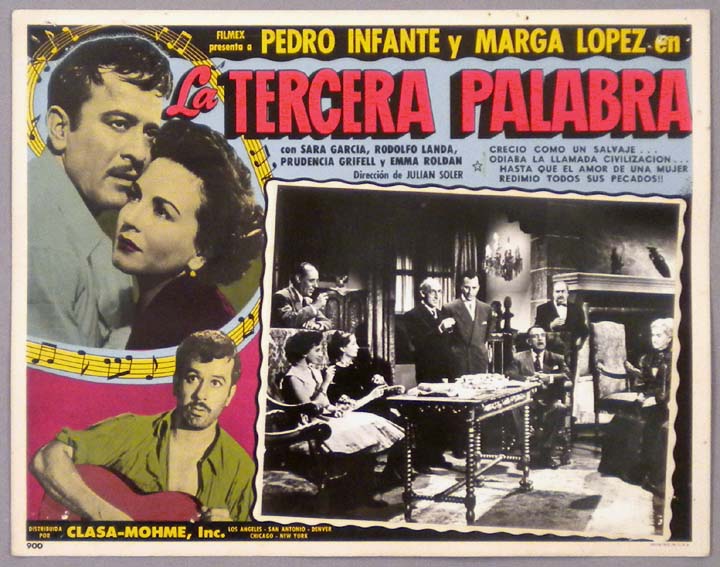 Eye-catching lobby card from an award-winning, Mexican film. The card film lobby card features great images of popular actor Infante on the border art. The card has average signs of handling -- a number of pinholes and a few light bends -- but the colors are bright and there are no major flaws... The film starred Pedro Infante, Marga Lopez, Sara Garcia, Prudencia Grifell and Rodolfo Landa. $10 |