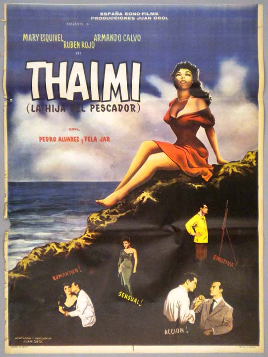 Beautiful Mexican movie poster pictures the sexy Ms. Esquivel sitting on a rocky cliff, above the sea. There are also smaller images of other characters from the film. Vivid coloring and lovely design! The poster has wear and tears along the edges/borders, plus a long repaired tear along the dark brown portion at the bottom. However, the tear is not very noticeable, and if matted and framed, the poster will actually display quite well... The film starred Mary Esquivel, Armando Calvo, Ruben Rojo, Fela Jar, Pedro Alvarez and Rosendo Rosell. (This poster has only limited, very mild fold lines -- so it will be sent rolled.) $30 |
