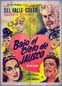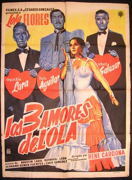 Wonderful comedy film poster has great images of the four main stars. Beautiful Lola Flores tries to choose between her three suitors -- each of whom is holding a heart. This onesheet appears to have gotten damp at some point, leaving some mild waviness and light water marks on the yellow background area near the top. However, these flaws are not very distracting, and otherwise, the poster looks great... This movie starred Lola Flores, Agustin Lara, Luis Aguilar, Abel Salazar, Nono Arsu and Luis Musset. $30 |