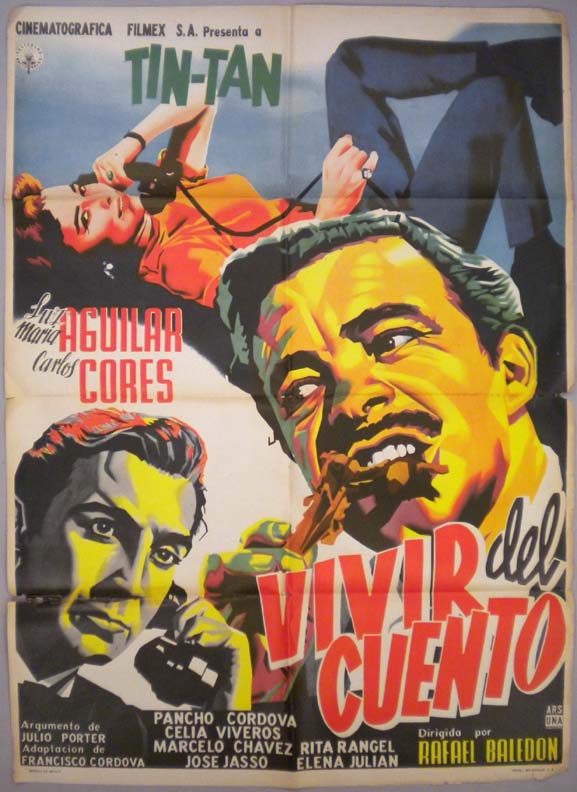 Great comedy film poster presents a colorful close-up portrait of comedian 'Tin Tan,' plus features an image of the two romantic leads talking on the telephone. This is a used poster that has some signs of handling-- separations at the fold lines, edge wear, small tears, and surface dings -- but the flaws are not very distracting and it will display quite well... This movie starred German 'Tin Tan' Valdes, Luz Maria Aguilar, Carlos Cores and Pancho Cordova. $30 |