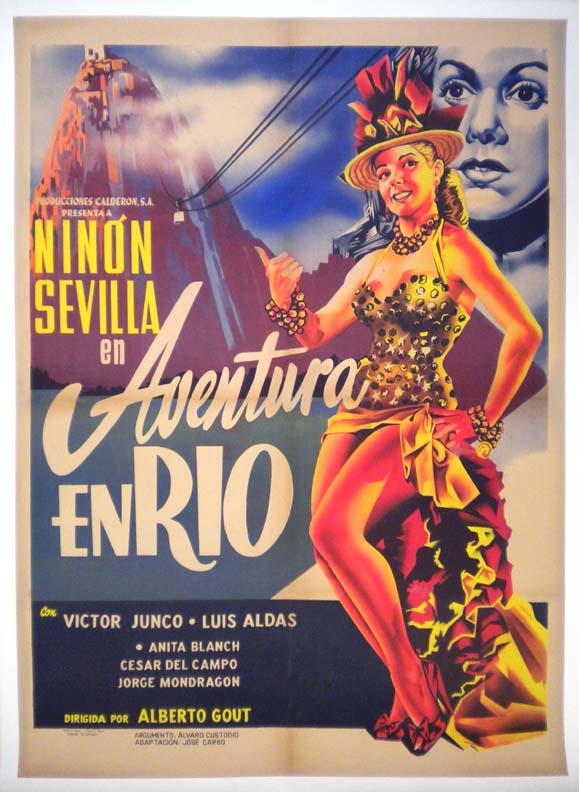 Stylish Mexican musical / comedy film poster -- with a dancing-motif -- has great color and striking graphics. It pictures two scantily-clad women and lots of lovely dancing legs. Beautiful poster with great style! There is a bit of rtoning/estoration along the top fold line, but this is not very distracting and the poster will display quite well... The film starred Elsa Aguirre, Miroslava Stern, Ruben Rojo, Consuelo Guerrero de Luna and Jorge Reyes. (This poster is mounted on linen, so it must be sent rolled.) $375 |