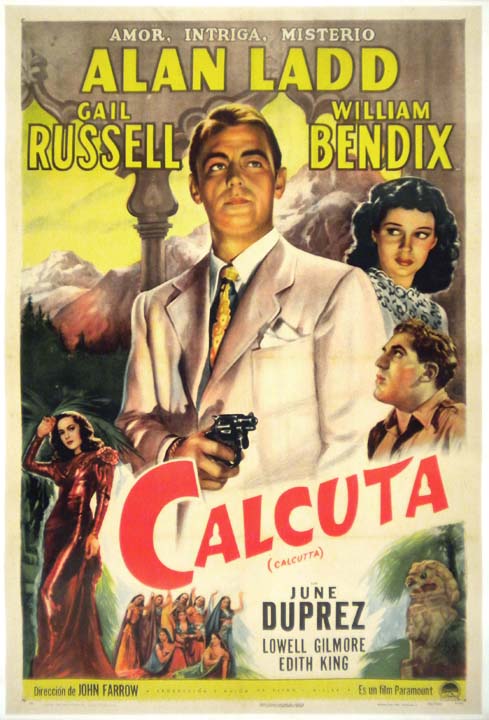 Beautiful Mexican film noir movie poster has a great image of Alan Ladd and femme fatale Gail Russell. This is a Spanish language poster from a classic American crime movie... The film starred William Bendix, June Duprez and Lowell Gilmore. (This poster is mounted on linen, so it must be sent rolled.) $250 |