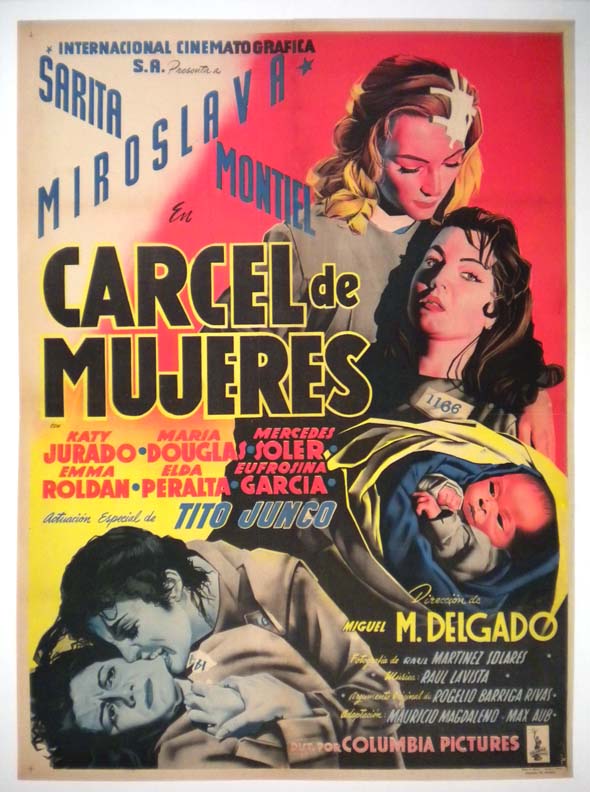 Stunning Mexican film noir / women-in-prison / bad girl movie poster pictures a montage of images including female inmates, a baby born in the big house, plus a weird cat-fight involving biting! WOW!... The film starred Miroslava, Sara Montiel, Katy Jurado, Maria Douglas and Mercedes Soler. (This poster is mounted on linen, so it must be sent rolled.) $395 |