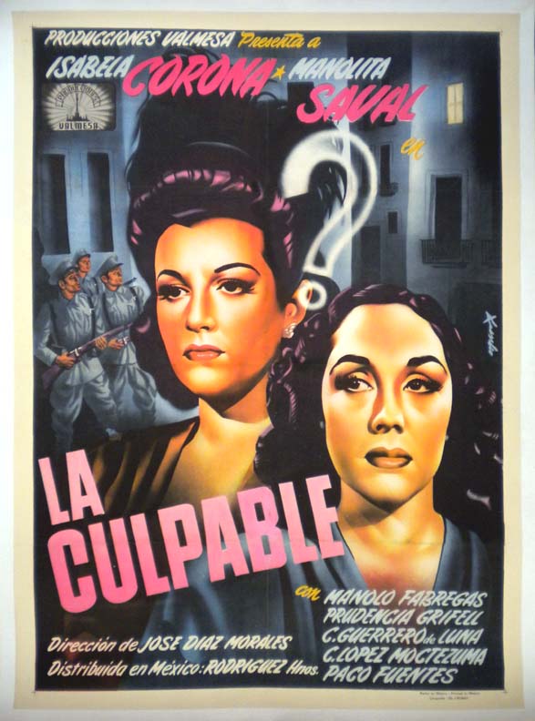 Impressive early Mexican melodrama movie poster features lovely close-up portraits of Isabela Corona and Manolita Saval separated by a ominous question mark. There is some touch-up around the B in CULPABLE, but this does not detract from the main image. Otherwise, the poster will display beautifully... The film starred Isabela Corona, Manolita Saval, Manolo Fabregas and Prudencia Grifell. (This poster is mounted on linen, so it must be sent rolled.) $425 |