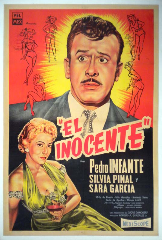 Very Colorful Argentine onesheet poster (29x43") from a classic Mexican comedy / romance movie. The one-sheet features a great portrait of a befuddled Infante, plus a smaller image of the sexy Ms. Pinal. Simply beautiful!... The film starred Pedro Infante, Silvia Pinal, Sara Garcia, Oscar Ortiz de Pinedo and Armando Saenz. (This poster is mounted on linen, so it must be sent rolled.) $395 |