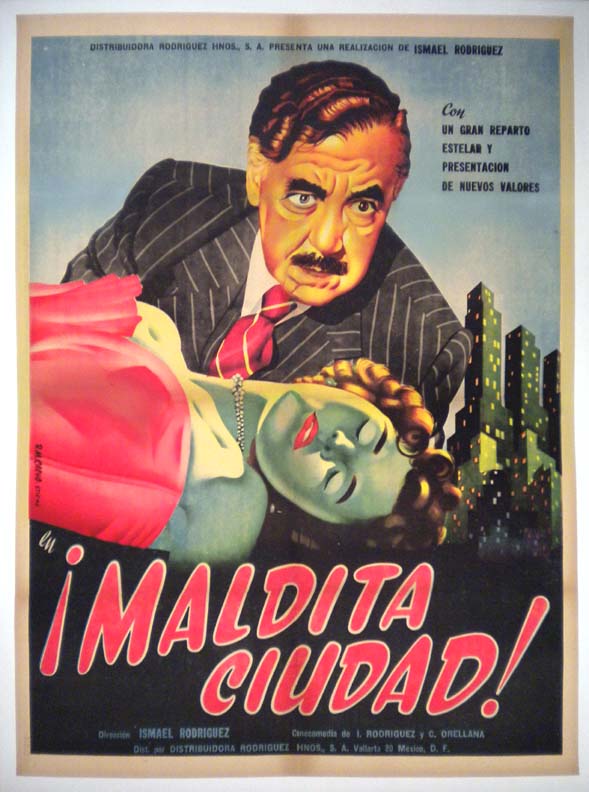 Stunning Mexican romance film poster with a definite film noirish style. The art work is both striking and vibrantly colored -- with superb portraits of the two stars, plus a city backdrop -- where everything seems a bit off-kilter.... The film starred Sara Garcia, Meche Barba, Carlos Orellana, Luis Beristain and Lupe Inclan. (This poster is mounted on linen, so it must be sent rolled.) $395 |