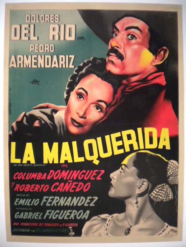 Classy Mexican ranchera / comedy movie poster pictures two of the greatest south-of-the-border cinematic icons ... Del Rio and Armendariz. There is a lovely romantic portrait of the pair!... The film starred Dolores del Rio, Pedro Armendariz, Columba Dominguez, Roberto Canedo, Julio Villarreal and Mimi Derba. (This poster is mounted on linen, so it must be sent rolled.) $450 |