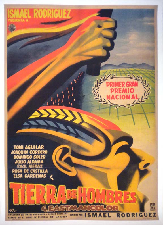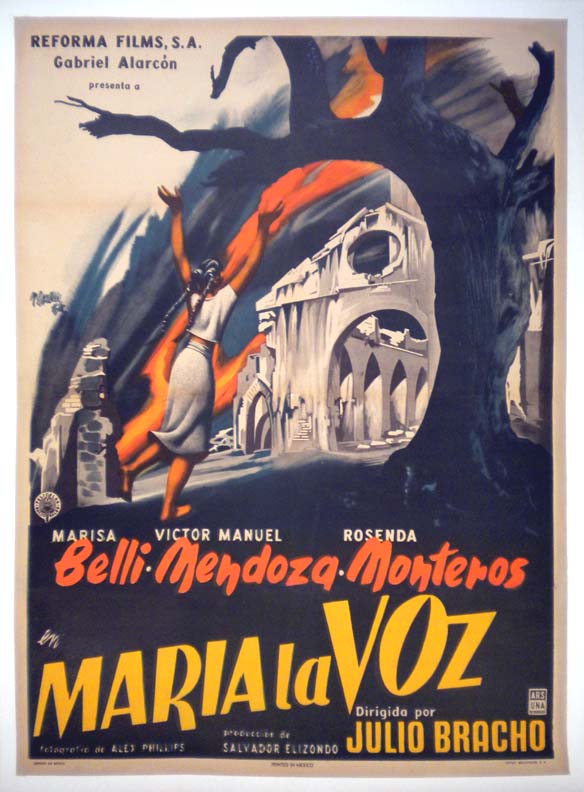 Elegant Art Deco style Mexican movie posterwas produced to promote this award-winning film. The superb art work features striking imagry and beautiful colors!... The film starred Domingo Solar, Antonio Aguilar, Joaquin Cordero, Julio Aldama and Elsa Cardenas. (This poster is mounted on linen, so it must be sent rolled.) $495 |