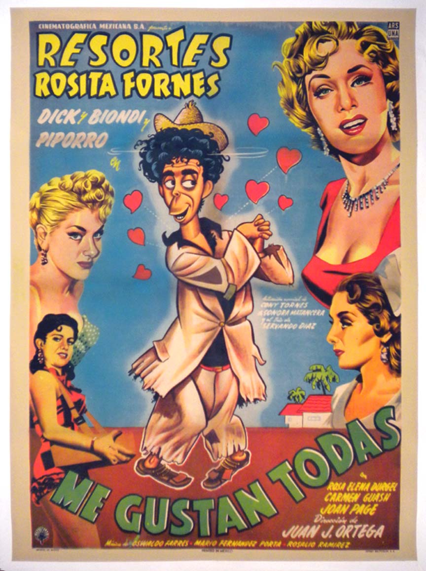 Beautiful Mexican comedy film poster features colorful caricatures of Resortes and the lovely Ms. Fornes... The film starred Adalberto 'Resortes' Martinez, Rosita Fornes, Eulalio 'Piporro' Gonzalez and Rosa Elena Durgel. (This poster is mounted on linen, so it must be sent rolled.) $375 |