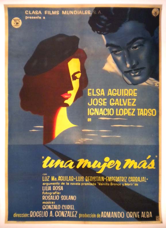 Alluring Mexican movie poster features great images of the two main stars -- the caricature of Ms. Aguirre is quite stylized and appealing! This movie was also released as, Vainilla, Bronce y Morir... The film starred Elsa Aguirre, Jose Galvez, Ignacio Lopez Tarso, Luz Maria Aguilar and Luis Beristain. (This poster is mounted on linen, so it must be sent rolled.) $325 |