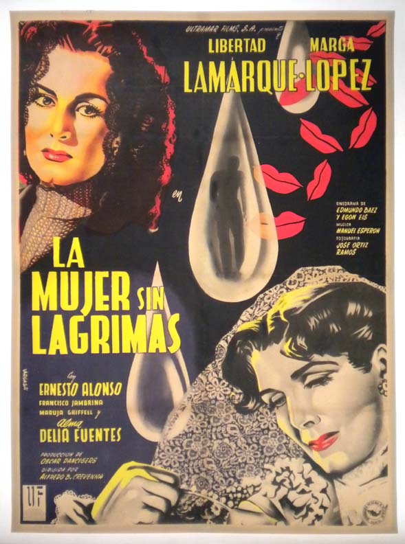 Stylish and attractive Mexican period film poster features wonderful graphics, including the central image of a figure trapped inside a tear!... The film starred Libertad Lamarque, Marga Lopez, Ernesto Alonso, Francisco Jambrina and Maruja Grifell. (This poster is mounted on linen, so it must be sent rolled.) $475 |