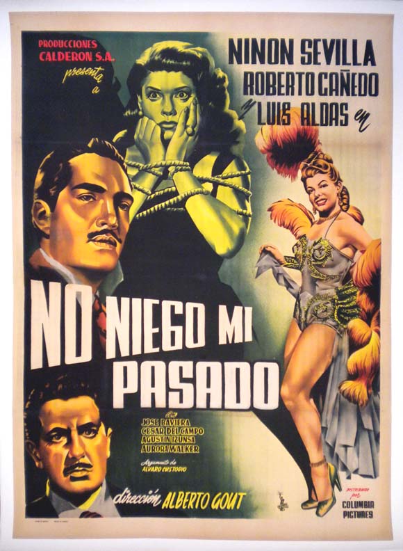 Wonderful Mexican film noir movie poster features two great images of Ninon Sevilla -- one as a sexy showgirl and the other as a frightened woman in bondage. Superb graphics and design in a Renau like style!... The film also starred Roberto Canedo, Luis Aldas, Jose Baviera and Aurora Walker. (This poster is mounted on linen, so it must be sent rolled.) $425 |