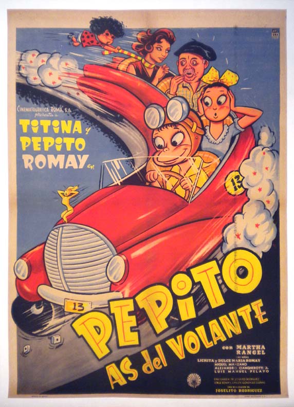 Outstanding comedy film poster presents a wonderful image of a family riding in a speeding roadster, which is being driven by a child. One of the classic posters of the era, it features dazzling style and vibrant coloring. There is a fairly light printing flaw -- a mild black smudge line -- running the length of the onesheet vertically, about 5" in from the right border. However, this flaw is not very distracting, and otherwise, the colors are bright and the poster displays beautifully... The film starred Pepito Romay, Titina Romay, Martha Rangel and Luis Manuel Pelayo. (This poster is mounted on linen, so it must be sent rolled.) $445 |