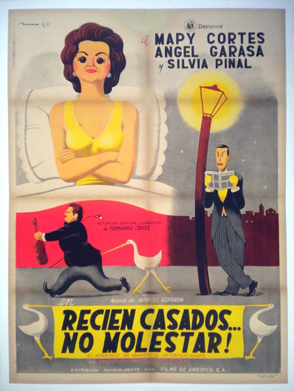 Amazing and stylish Mexican comedy movie poster has the feeling and graphics of a film noir! A man playing piano as a sexy femme fatale woman appears in a whisp of smoke. It is both beautiful and striking!... The film starred Ramon Armengod, Meche Barba, Jose Ma Linares-Rivas, Beatriz Ramos and Patricia Moran. (This poster is mounted on linen, so it must be sent rolled.) $495 |