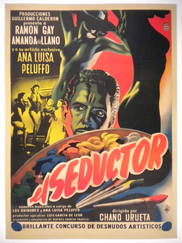 Colorful and striking Mexican movie poster features an intense, film-noirish art style -- with a central image of Gay surrounded by some of his alluring female conquests. This has the look of a Renau design, but it is not signed... The film starred Ramon Gay, Ana Luisa Peluffo, Amanda del Llano and Jose Luis Jimenez. (This poster is mounted on linen, so it must be sent rolled.) $450 |