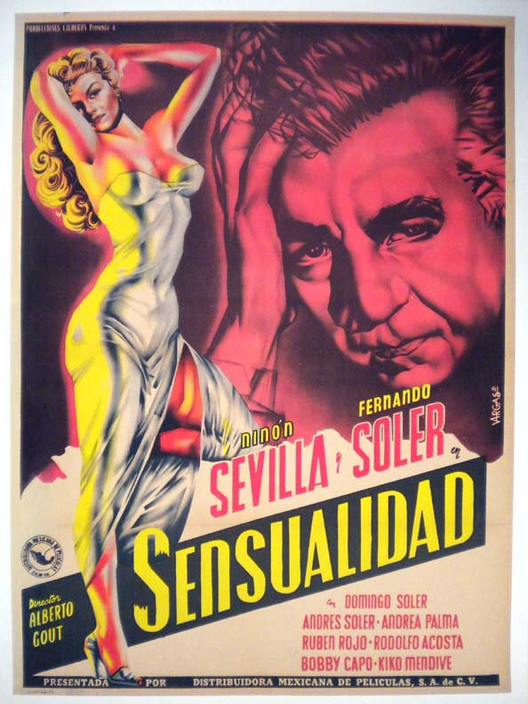 Beautiful Mexican film noir movie poster has a great image of the seductive Ms. Sevilla, plus a close-up of and anguished Soler. This highly desirable poster has been professionally restored along the left side. The poster had apparently gotten damp at some point and there was heavy damage / paper loss along the left edge -- which entered the edge of the printed area. This poster has had restoration along the entire left border, and it was very well done. Unless you look closely, the poster looks to be almost mint, and it displays superbly. (See the bargain poster section to see what the poster looked like before restoration)... The film starred Fernando Soler, Ninon Sevilla, Domingo Soler, Rodolfo Acosta and Ruben Rojo. (This linen-backed poster will be shipped rolled.) $395 |