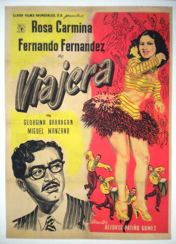 Attractive Mexican movie poster pictures a bookwormish Fernandez watches as the sexy Ms. Carmina performs an alluring dance. Early art work done in an almost stone litho style!... The film starred Rosa Carmina, Fernando Fernandez, Georgina Barragan and Miguel Manzano. (This poster is mounted on linen, so it must be sent rolled.) $350 |