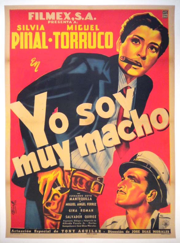 Colorful tough-girl themed movie poster from a popular Mexican comedy film. The onesheet features a superb image of a very butch looking Pinal smoking a cigar, packing a six-shooter, and wearing a man's suit. A confused Torruco looks on... This film starred Silvia Pinal, Miguel Torruco, Antonio Aguilar, Fernando 'Mantequilla' Soto and Gina Romand. (This poster is mounted on linen, so it must be sent rolled.) $495 |