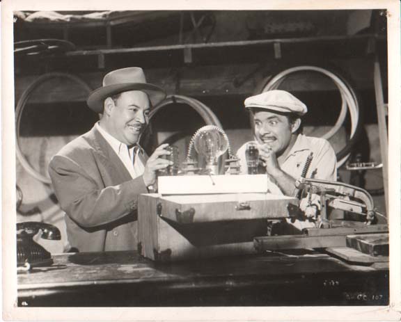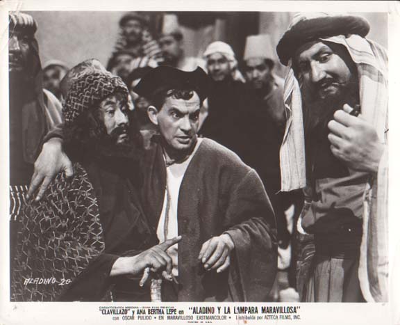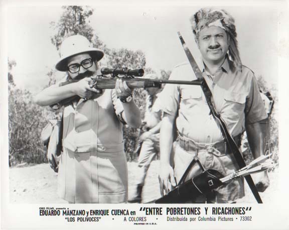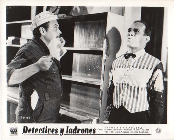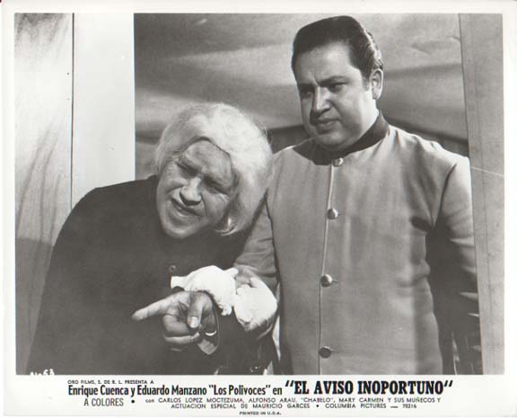 Original B&W still from a 1966 Mexican comedy film. The photo has some pinholes -- mainly near the corners -- but otherwise, it is clean and bright... This movie starred Marco Antonio Campos 'Viruta,' Gaspar Henaine 'Capulina,' Marta Romero, Manuel 'Loco' Valdes, Hector Lechuga, Cynthia Mandan, German 'Tin Tan' Valdes and Luis Aguilar. $10 |