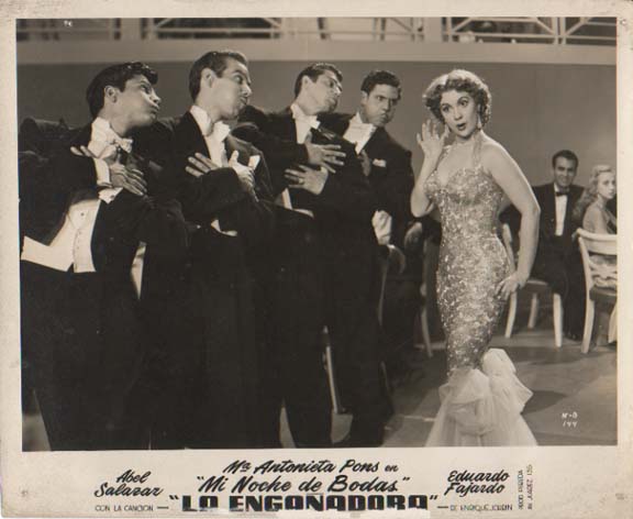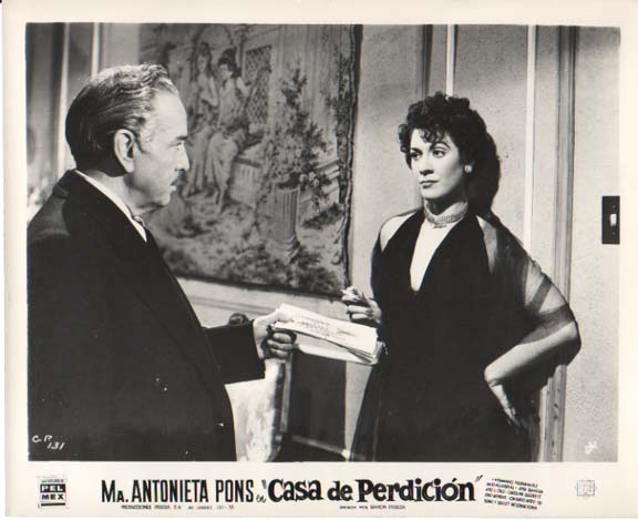 Original B&W still from a 1954 Mexican film. Great shot of sexy Ms. Pons wearing the same see-thru dress pictured on the onesheet poster!... This movie starred Maria Antonieta Pons, Fernando Fernandez, Julio Villarreal and Jose G. Cruz. $20 |