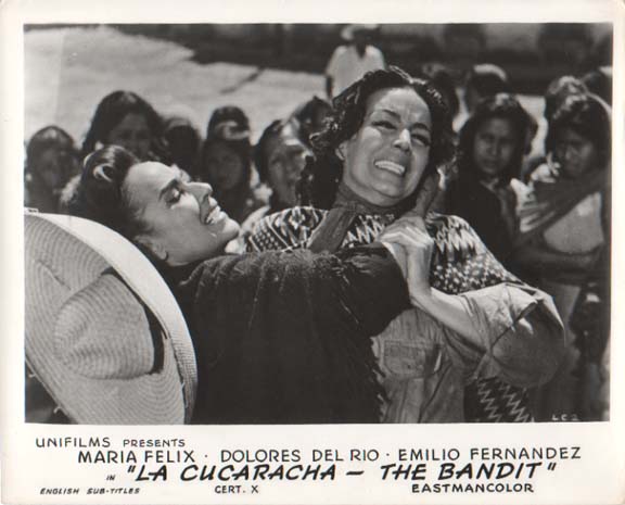 Original B&W still from a 1958 Mexican film. The photo features a great shot of Maria Felix threatening Dolores del Rio. Light signs of use -- but no major flaws... This movie starred Maria Felix, Dolores del Rio, Emilio Fernandez, Antonio Aguilar and Flor Silvestre. $20 |
