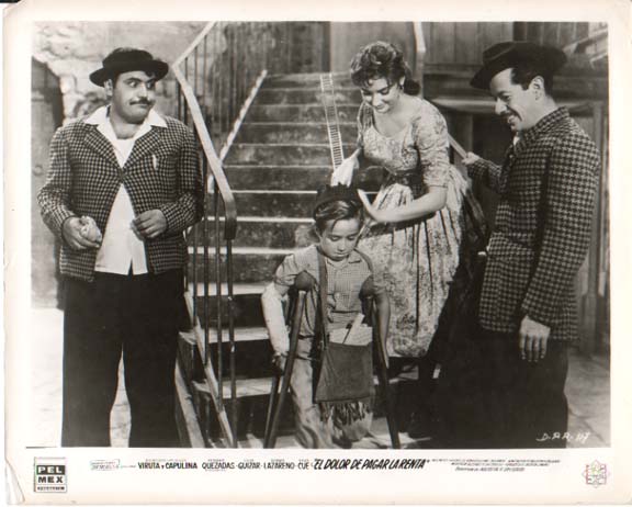 Original B&W still from a 1963 Mexican biographical film. Good image of Viruta y Capulina. The photo has a few pinholes at the corners, but otherwise, it is clean and bright... This movie starred Jose Infante Cruz, Maricruz Olivier, Begona Palacios, Lilia Prado, Fanny Schiller, Viruta y Capulina and many other guest stars. $15 |