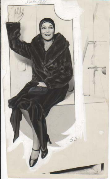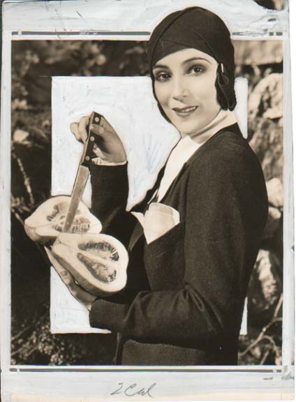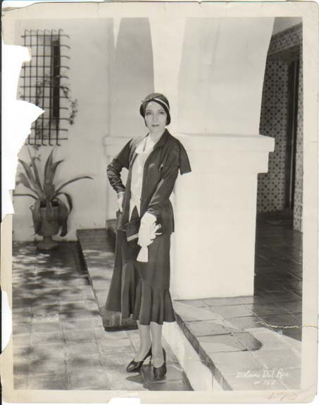 Original 1920s studio portrait of Dolores del Rio. This photo was apparently used as an illustration for a newspaper, or magazine. The left background section has been trimmed. There are also some publisher's cropping marks -- including quite a bit of hand-painted embellishments/highlights surrounding Ms. del Rio -- so that the actress would stand out more clearly. There are a few other notations, handwritten on the reverse side of the photo, in addition to an original info snipe. The original date was Oct. 30, 1928. $25 |
