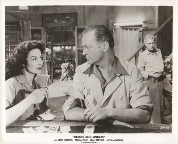 Original B&W still from a 1955 French adventure film... This movie starred Yves Montand, Maria Felix, Jean Servais, Elisabeth Manet, Gert Frobe and Curd Jurgens. $15 |