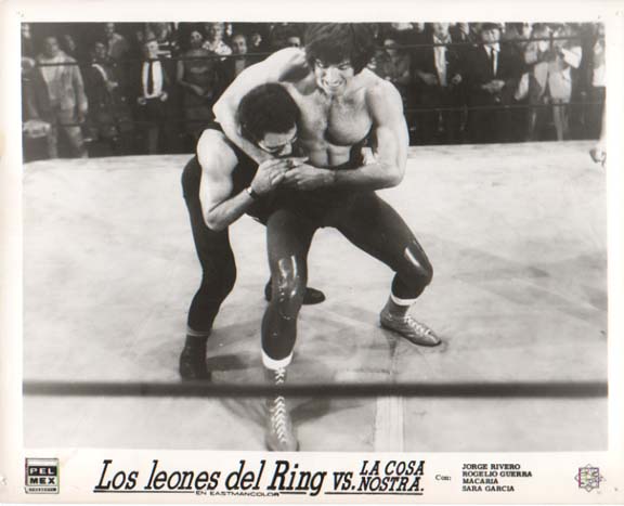 Original B&W still from a 1972 Mexican lucha libre film. There is a great image of a shirtless Jorge Rivero in the ring. The photo has a few pinholes near the corners -- but otherwise, it is clean and bright... This movie starred Jorge Rivero, Rogelio Guerra, Sara Garcia, Roberto Canedo, Macaria and Lobo Negro. $15 |