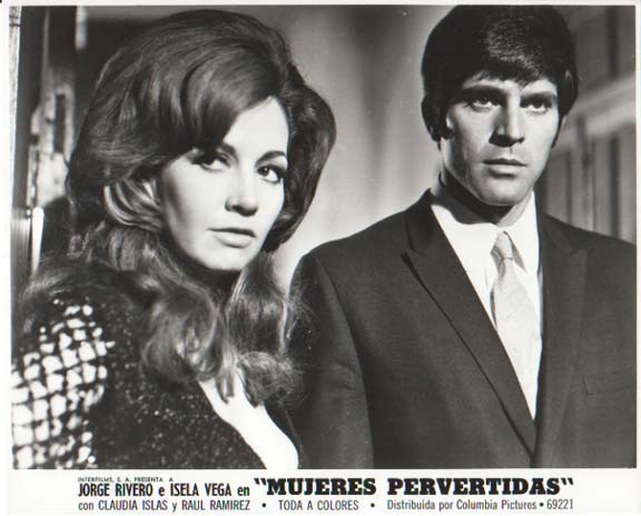 Original B&W still from a 1969 Mexican crime film. Nice close-up of Jorge Rivero. part of the white borders have been trimmed, but this minor flaw does not affect the image area. Otherwise, the photo is clean and bright... This movie starred Jorge Rivero, Isela Vega, Eduardo de la Pena, Claudia Islas, Consuelo Frank and Raul Ramirez. $15 |