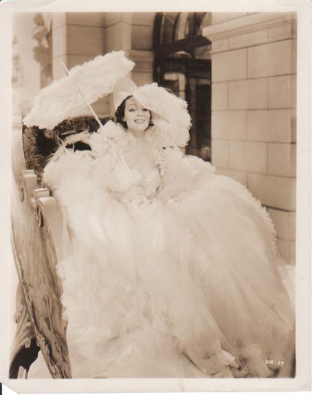 Original studio portrait of Dolores del Rio was probably taken in the mid to late 1920s. This photo was apparently used as an illustration for a newspaper, or magazine. There are some publisher's cropping marks -- including quite a bit of hand-painted embellishments/highlights surrounding Ms. del Rio -- so that the actress would stand out more clearly. The mentioned publisher alterations could probably be removed, with a damp cloth, if so desired. The still also has some large border chips along the left edge and at the lower right corner -- but the main image is not greatly affected. $15 |